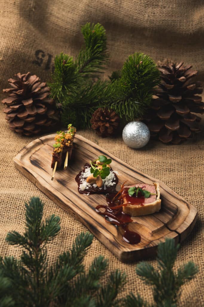 Jólaplatti, tvireykt hangikjöt, 12 mánaða óðals tindur og ristaðar kasjúhnetur, sveitapate & cumberland sósa. Andarbringa á spjóti, marineruð í appelsínu & teriyaki