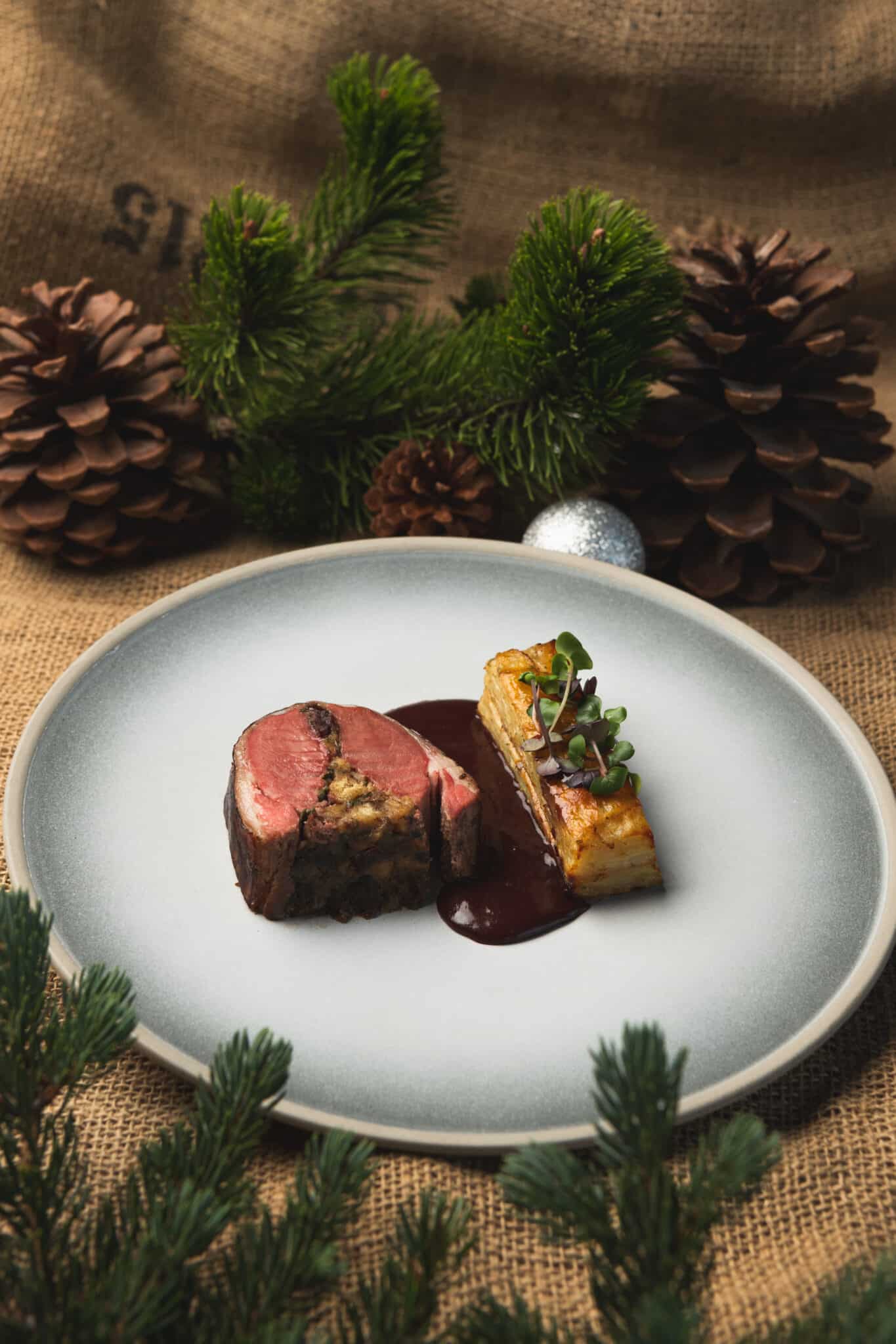 Fylltur lambahryggur, pomme Anne, rauðvinssósa og fylltar morellur